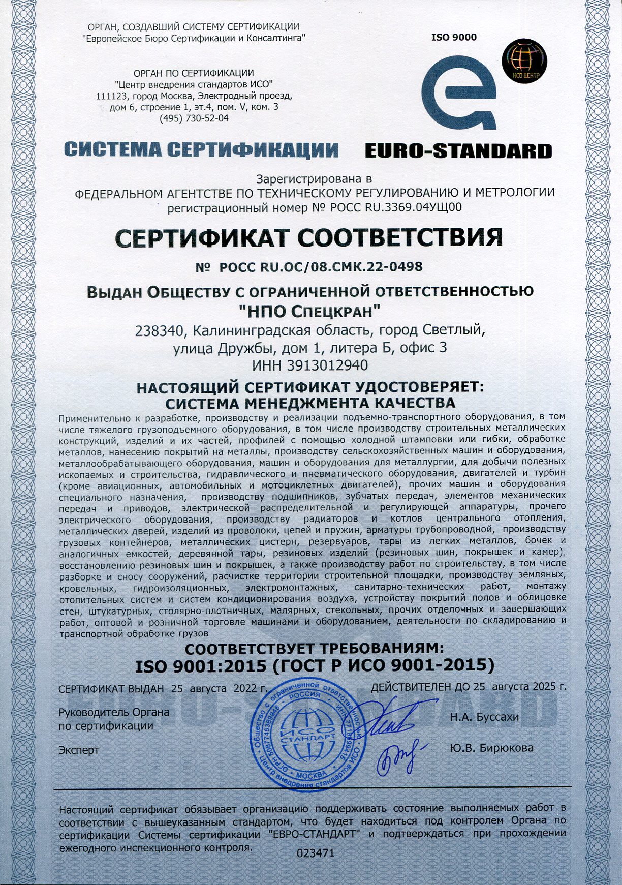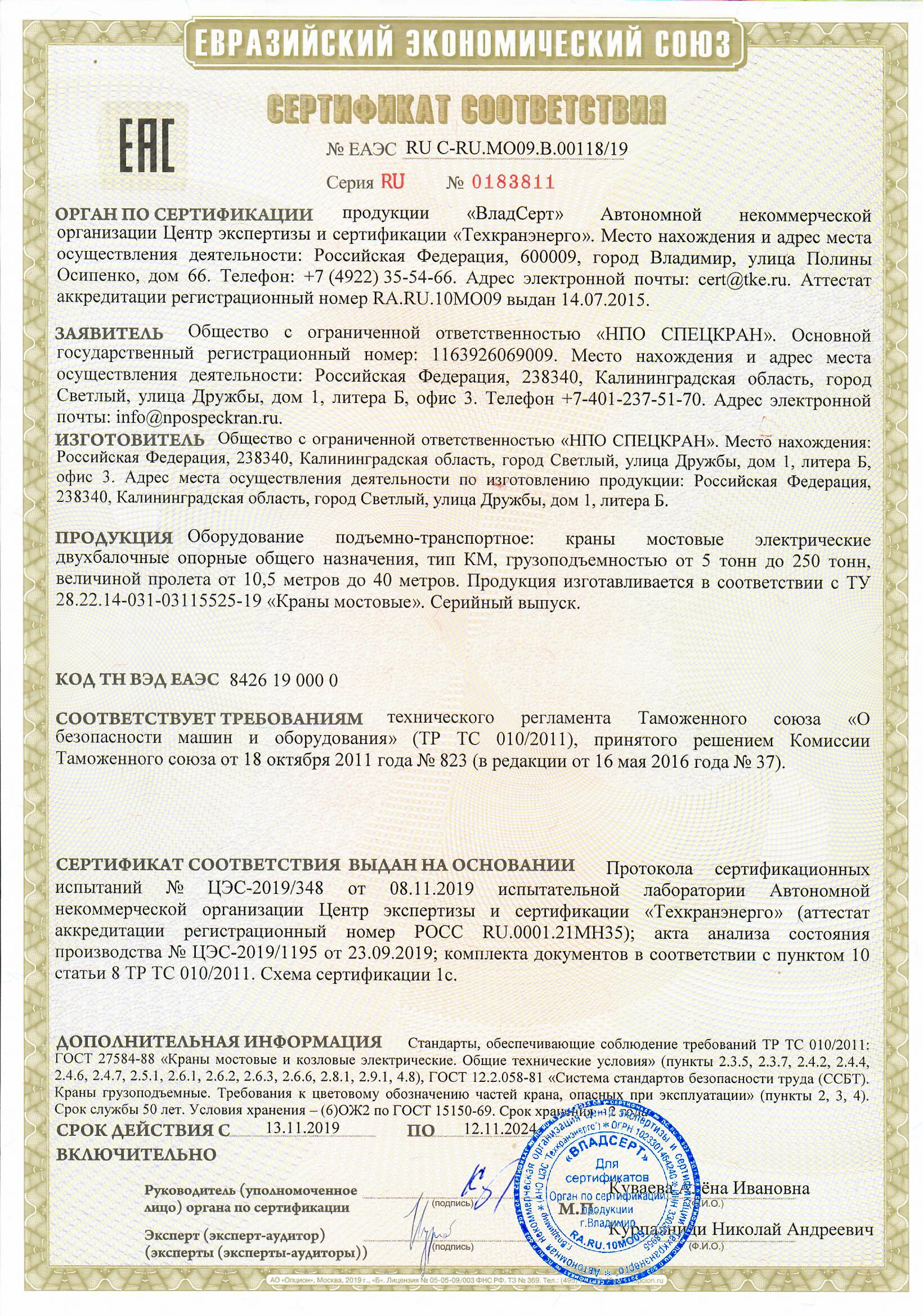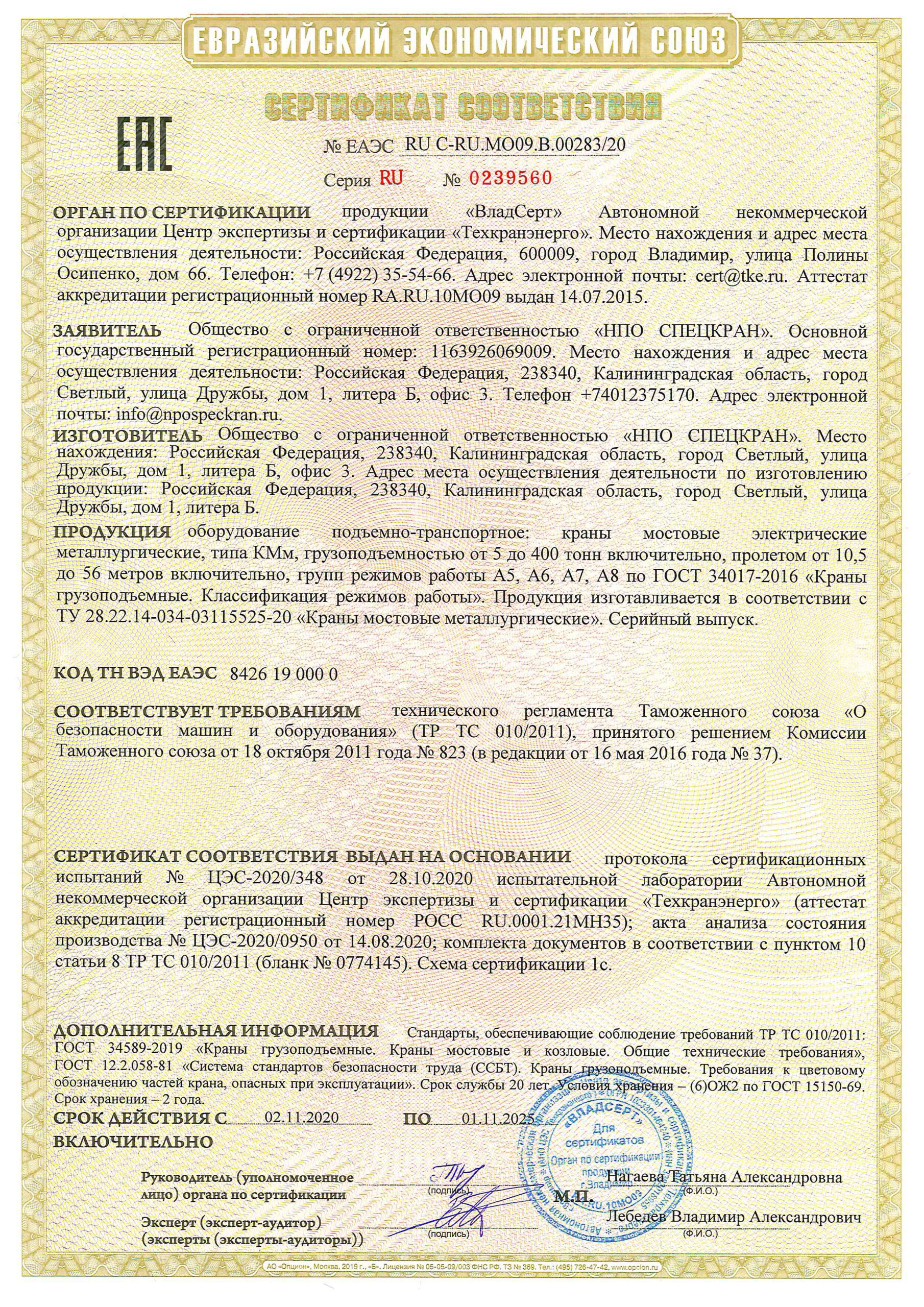 Speckran’s activities are aimed at fully satisfying the interests of the Customer, including by expanding the range of manufactured equipment with special cranes – this is the main promising area of the company’s activities.